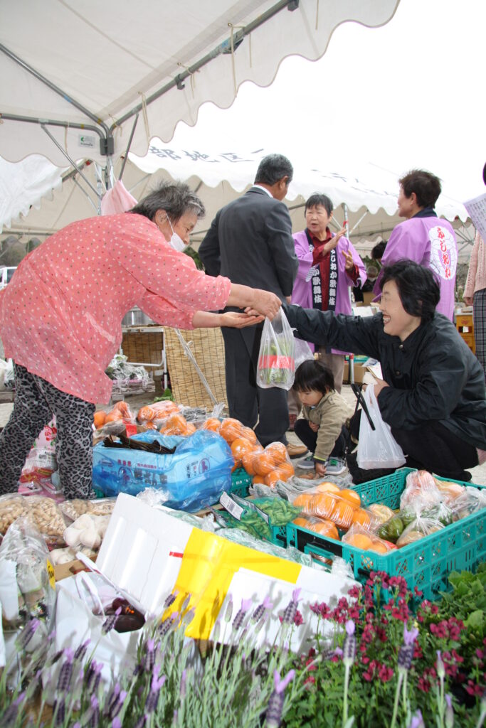 朝市は、毎月あり、第一土曜日に石畳足湯にて開かれます。