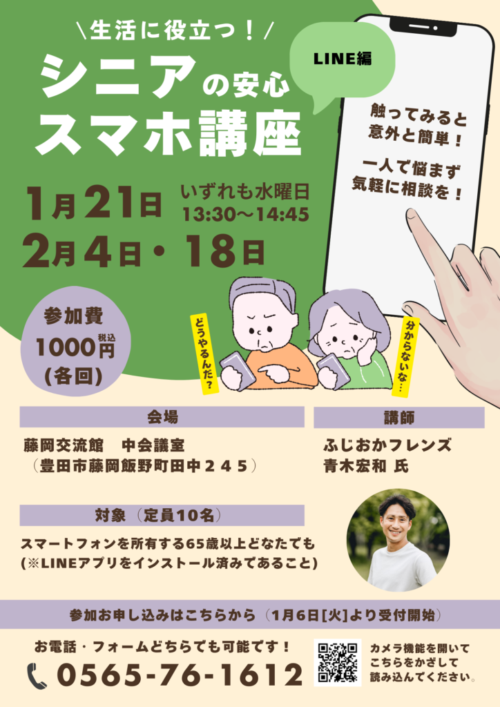 | 対象 | スマートフォンを所有する65歳以上どなたでも (受講時にLINEアプリをインストール済みであること) |