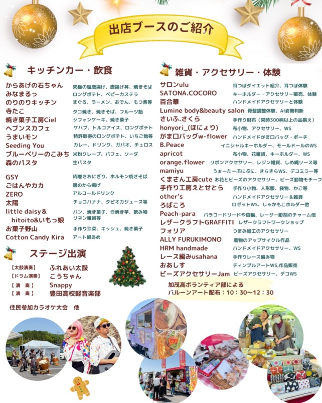 グルメや雑貨・アクセサリーの販売、キッチンカーの出店などがあります。また、ステージ出演も予定されています。クリスマスの雰囲気が味わえるマルシェへぜひお出かけください♪